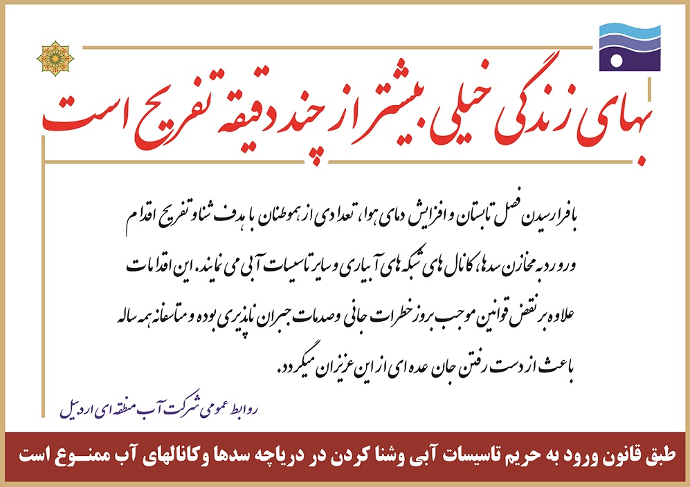 معاون حفاظت و بهره برداری شرکت آب منطقه ای اردبیل گفت: مخازن سدها، کانالهای انتقال آب و حوضچه های ایستگاه های پمپاژ به هیچ وجه محل امن و مناسبی برای شنا نیستند و هرسال تعداد زیادی از افراد با شنا کردن غیر مجاز در چنین مکان های نامطمئن و خطرناک، جان خود را از دست می دهند که مطابق مقررات ورود به تاسیسات آبی و شنا کردن در دریاچه سدها و کانالهای آبیاری ممنوع می باشد.