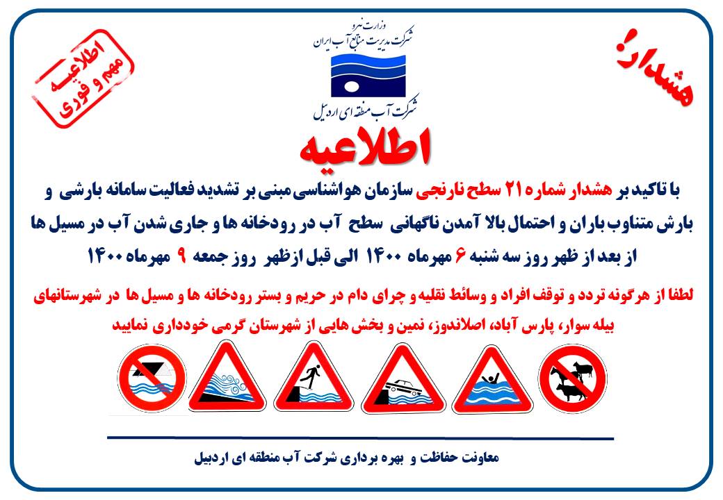 معاونت حفاظت و بهره برداری شرکت آب منطقه ای اردبیل با صدور اطلاعیه ای از هموطنان خواست تا از هرگونه تردد و توقف افراد و وسائط نقلیه و چرای دام در حریم و بستر رودخانه ها و مسیل های شهرستان های بیله سوار، پارس آباد، اصلاندوز، نمین و بخش هایی از شهرستان گرمی از روز سه شنبه 6 مهرماه لغایت روز جمعه 9 مهرماه 1400 خودداری نمایند.