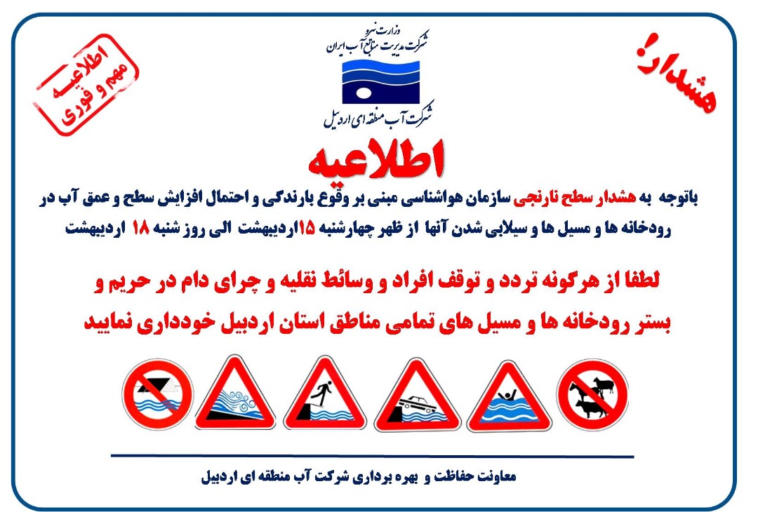 معاون حفاظت و بهره برداری شرکت آب منطقه ای اردبیل با صدور اطلاعیه ای از هموطنان خواست تا از هرگونه تردد و توقف افراد و وسائط نقلیه و چرای دام در حریم و بستر رودخانه ها و مسیل های استان اردبیل 15 اردیبهشت ماه تا 18 اردیبهشت ماه 1400 خودداری نمایند.