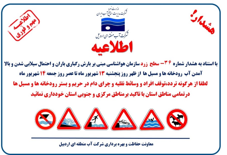 معاونت حفاظت و بهره برداری شرکت آب منطقه ای اردبیل با صدور اطلاعیه ای از هموطنان خواست از هرگونه تردد و توقف افراد و وسائط نقلیه و چرای دام در حریم و بستر رودخانه های تمامی مناطق استان علی الخصوص در مناطق مرکزی و جنوبی استان اردبیل خودداری نمایند.