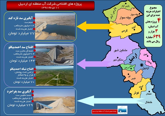 مدیرعامل شرکت آب منطقه ای اردبیل گفت:امروز با حضور ریاست جمهوری اسلامی ایران و وزیر نیرو، 4 پروژه مهم بخش آب استان با اعتباری بالغ بر 3 هزار و 639 میلیارد ریال افتتاح و آبگیری می شود.