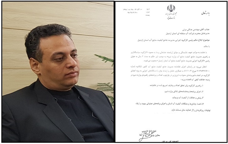 معاون آب و آبفای وزیر نیرو در حکمی مهندس عباس جنگی مرنی، مدیرعامل شرکت آب منطقه ای اردبیل را به عنوان رئیس کارگروه اجرایی مدیریت جامع کیفیت منابع آب استان اردبیل منصوب کرد.