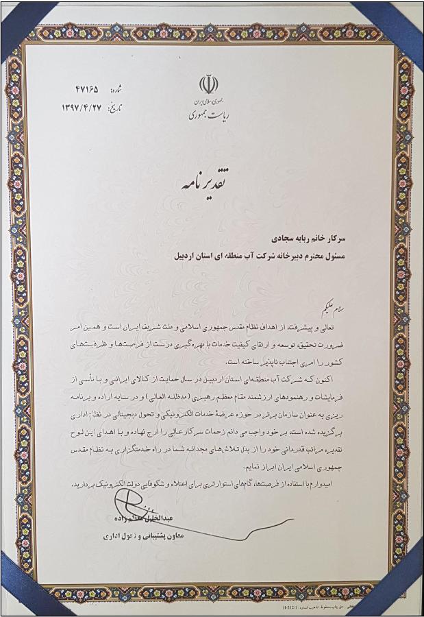 شرکت آب منطقه ای اردبیل به عنوان سازمان برتر در حوزه خدمات الکترونیکی و تحول دیجیتالی در نظام اداری برگزیده شد.