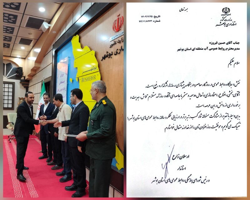 بر اساس نتایج ارزیابی استانداری بوشهر، روابط عمومی شرکت آب منطقهای بوشهر موفق به کسب رتبه برتر در میان روابط عمومیهای دستگاههای اجرایی استان شد.