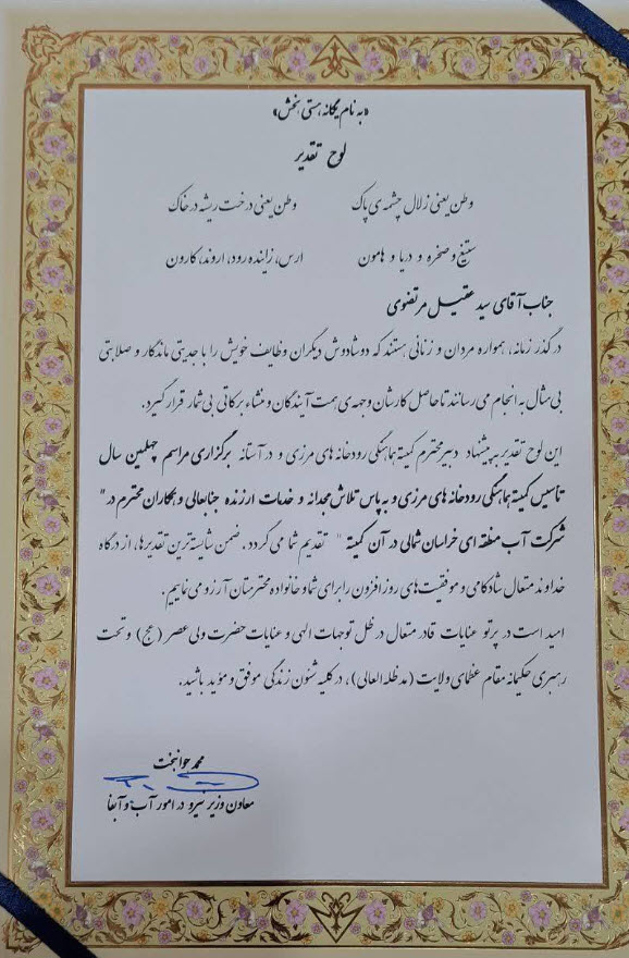 مدیرعامل شرکت مدیریت منابع آب ایران با اعطای لوح تقدیر به مدیرعامل شرکت آب منطقهای خراسان شمالی از فعالیتهای این شرکت در ساماندهی و تثبیت حریم رودخانههای مرزی استان تقدیر کرد.