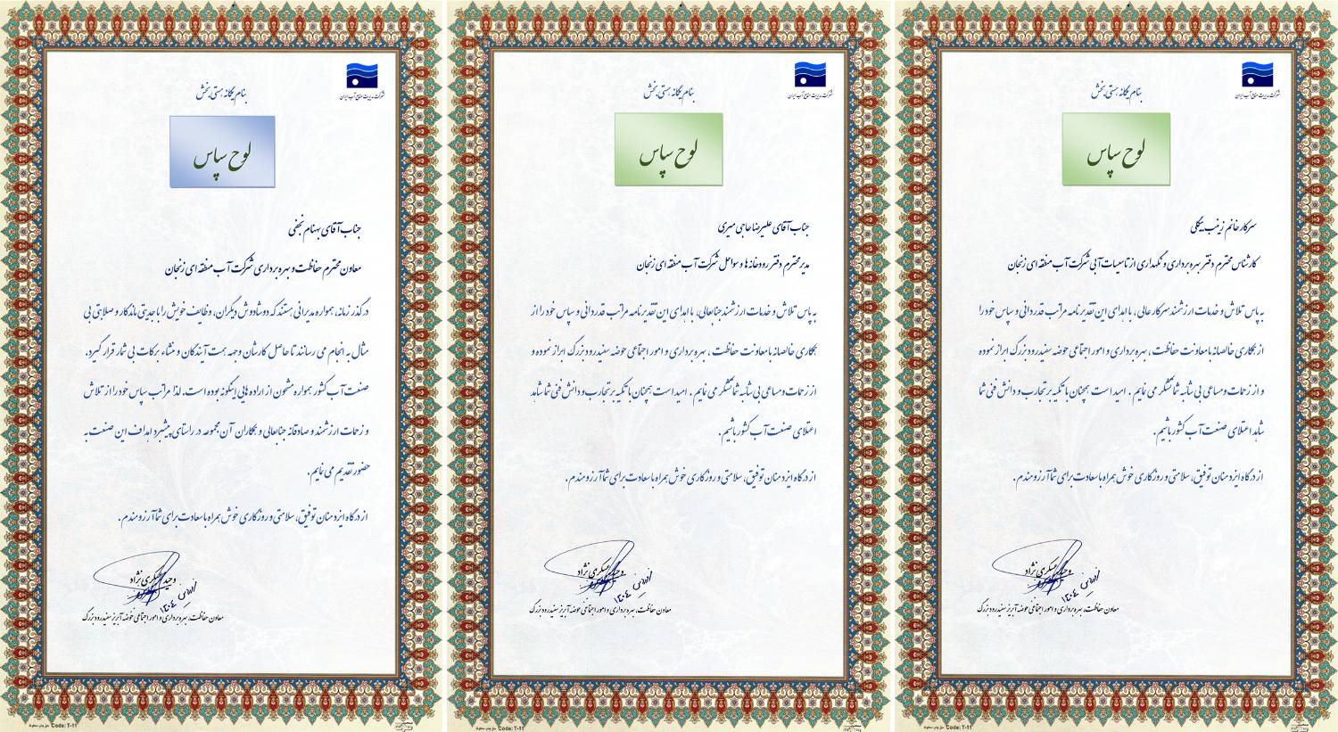 معاون حفاظت و بهرهبرداری شرکت مدیریت منابع آب ایران با ارسال لوح سپاس، از معاون حفاظت و بهرهبرداری شرکت آب منطقهای زنجان و همکاران وی در این بخش تجلیل کرد.