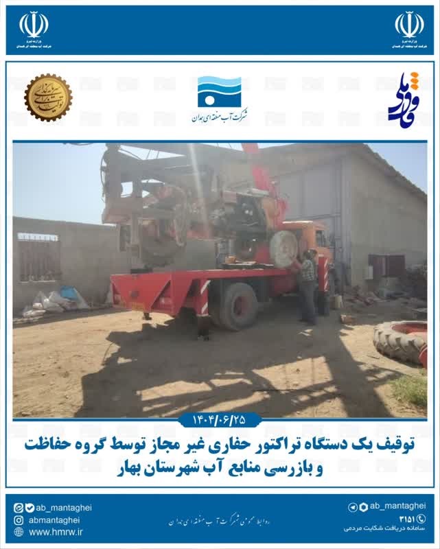 یک دستگاه تراکتورحفاری غیرمجاز توسط گروه گشت و بازرسی شهرستان بهار توقیف شد.