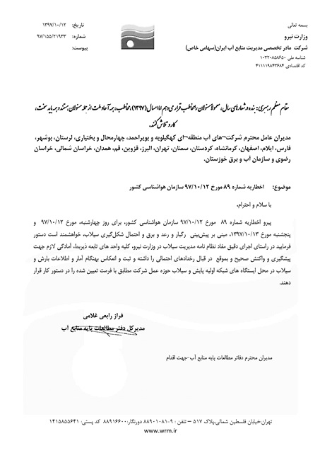 با عنایت به احتمال سیلابی شدن رودخانه ها و سیل ها در سطح استان از توقف، اسکان و اتراق در حاشیه منابع آبی جداً خودداری نمایید.