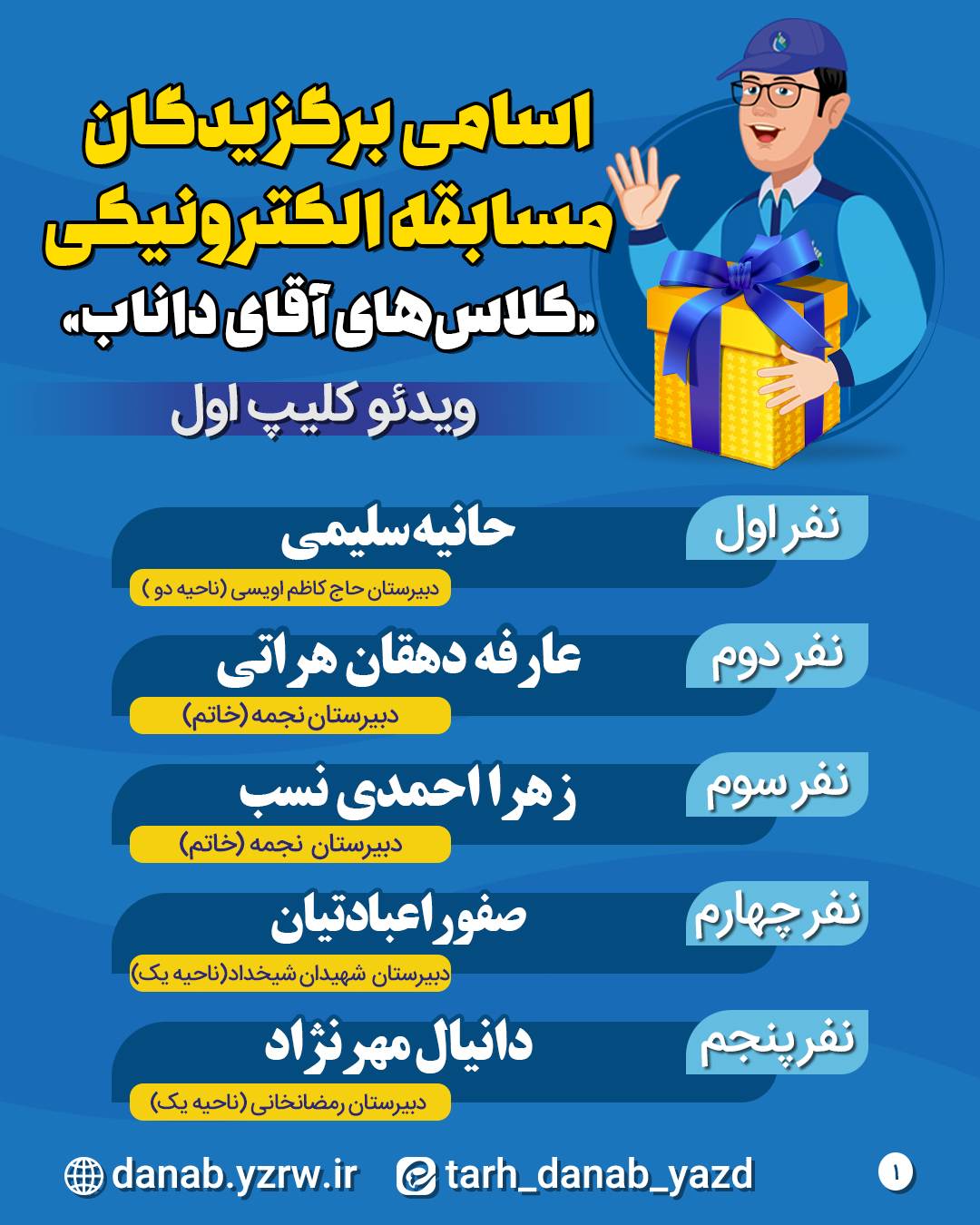 قرعهکشی مسابقه الکترونیکی ویدئو کلیپ اول کلاسهای آقای داناب در 25 بهمنماه د برگزار شد.