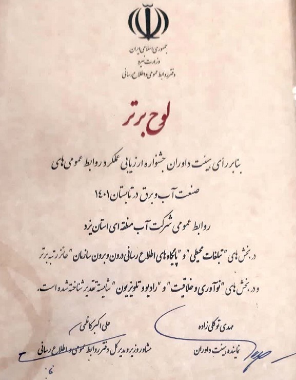 روابط عمومی شرکت آب منطقه ای یزد در جشنواره ارزیابی روابط عمومی های صنعت آب و برق کشور امروز 25 بهمن با حضور وزیرنیرو برگزار شد، خوش درخشید و با اهدای لوح سپاس مورد تجلیل قرار گرفت.