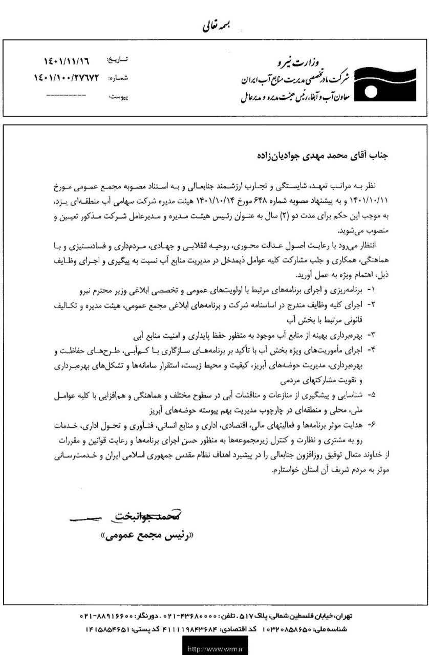 با حکم"محمد جوانبخت" رئیس هیئت مدیره و مدیرعامل شرکت مدیریت منابع آب ایران، "محمدمهدی جوادیان زاده" ۲ سال دیگر به عنوان رئیس هیئت مدیره و مدیرعامل شرکت آب منطقه ای یزد ابقا شد.