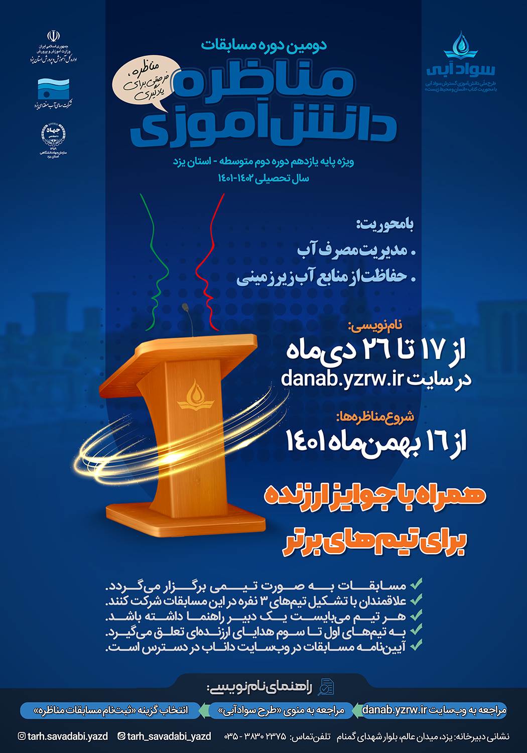 برای دومین سال متوالی از اجرای طرح گسترش سواد آبی، ثبت نام مسابقات مناظره این طرح از تاریخ 17 دیماه شروع شد.