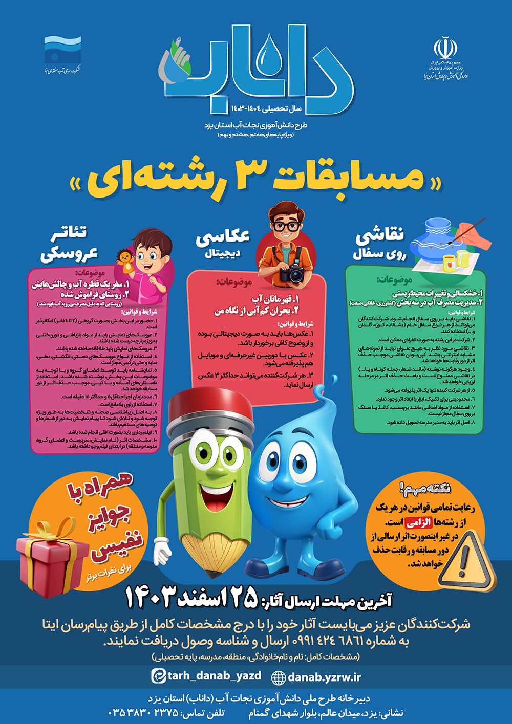 همزمان با هشتمین دوره اجرای طرح داناب در سال تحصیلی ۱۴۰۴-۱۴۰۳ مسابقات سه رشتهای فرهنگی و هنری در سه بخش، عکاسی، نقاشی روی سفال و تئاتر عروسکی آغاز شد.