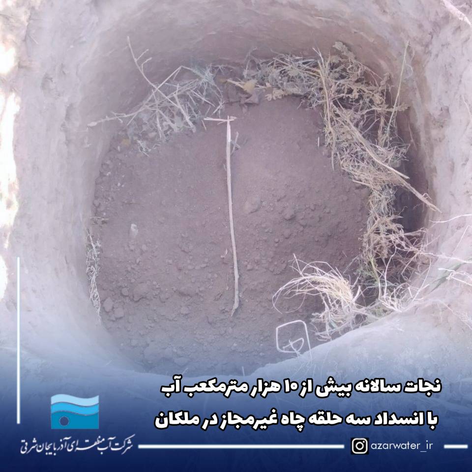 در راستای صیانت از منابع آب زیرزمینی و جلوگیری از برداشتهای غیرمجاز، با انسداد سه حلقه چاه غیرمجاز در اراضی شهر ملکان و روستاهای بایقوت و آقمنار، سالانه بیش از ۱۰ هزار مترمکعب آب از برداشت غیرقانونی نجات یافت.