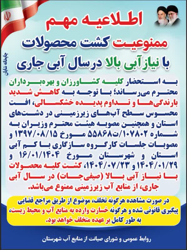 رئیس اداره منابع آب شهرستان باشت گفت: کشت محصولات با نیاز آبی بالا در سال آبی جاری در سطح این شهرستان ممنوع است.