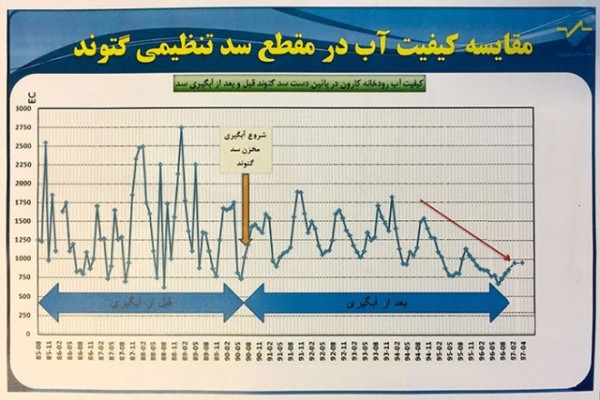 وی تصریح کرد: «میانگین میزان هدایت الکتریکی آب رها شده توسط سد گتوند طی ماههای گذشته در حد استانداردهای تکلیف شده بوده، حال آنکه همین شاخص که بیانگر میزان شوری و آلودگی آب است، در فاصله رها شدن از دریچه های این سد تا رسیدن به آبادان و خرمشهر، حدودا 12 برابر شده و از مرز 10 هزار واحد گذر می کند.»