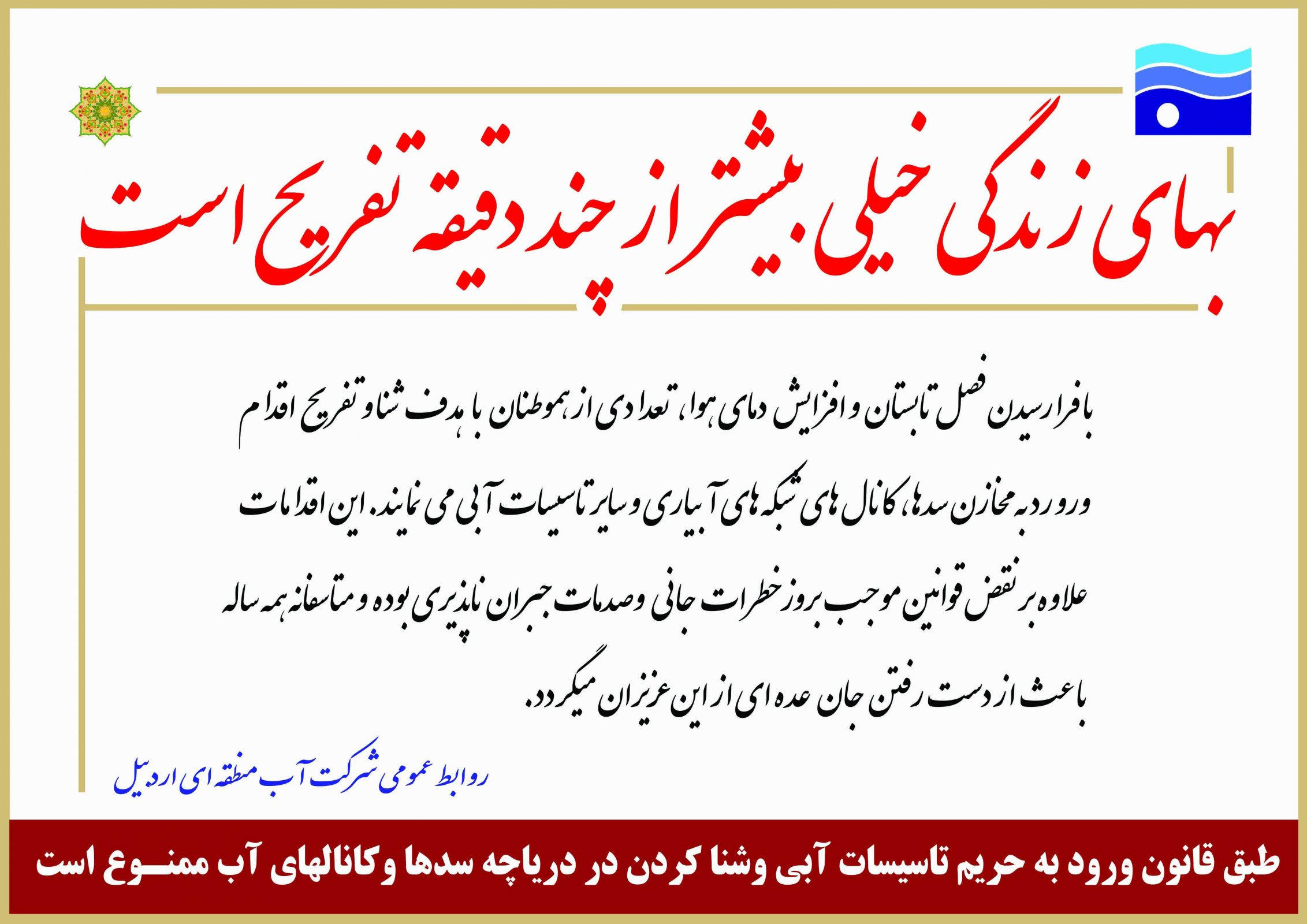 مدیرعامل شرکت آب منطقه ای اردبیل گفت: این شرکت با نصب تابلوهای هشداردهنده ورود ممنوع، شنا کردن ممنوع، ماهیگیری ممنوع و خطرغرق شدن در اطراف منابع آبی، ورود به حریم منابع آب و به ویژه تاسیسات آبی را ممنوع اعلام کرده است و مسئولیتی در خصوص حادثه احتمالی به دلیل ورود غیرمجاز و شناکردن در دریاچه سدها و داخل کانال ها و تاسیسات آبیاری و زهکشی نخواهد داشت.