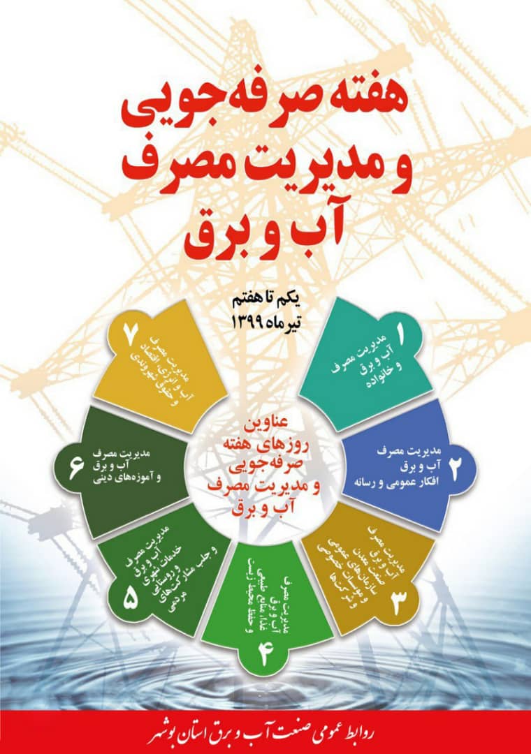 به گزارش روابط عمومی شرکت سهامی آب منطقه ای بوشهر، نزدیک به سه دهه است که اول تا هفتم تیرماه هر سال، هفته صرفهجویی در مصرف "آب" نام گذاری شده است و فصل گرما تداعی کننده مباحثی چون تبخیر، کمآبی، صرفهجویی و... بوده است، اما به منظور وفاق و هماهنگی در ارکان وزارت نیرو و لزوم توجه همگانی، امسال با توجه به لزوم صرفهجویی در مصرف برق نیز این هفته با نام هفته صرفهجویی در آب و برق نامگذاری شده است.