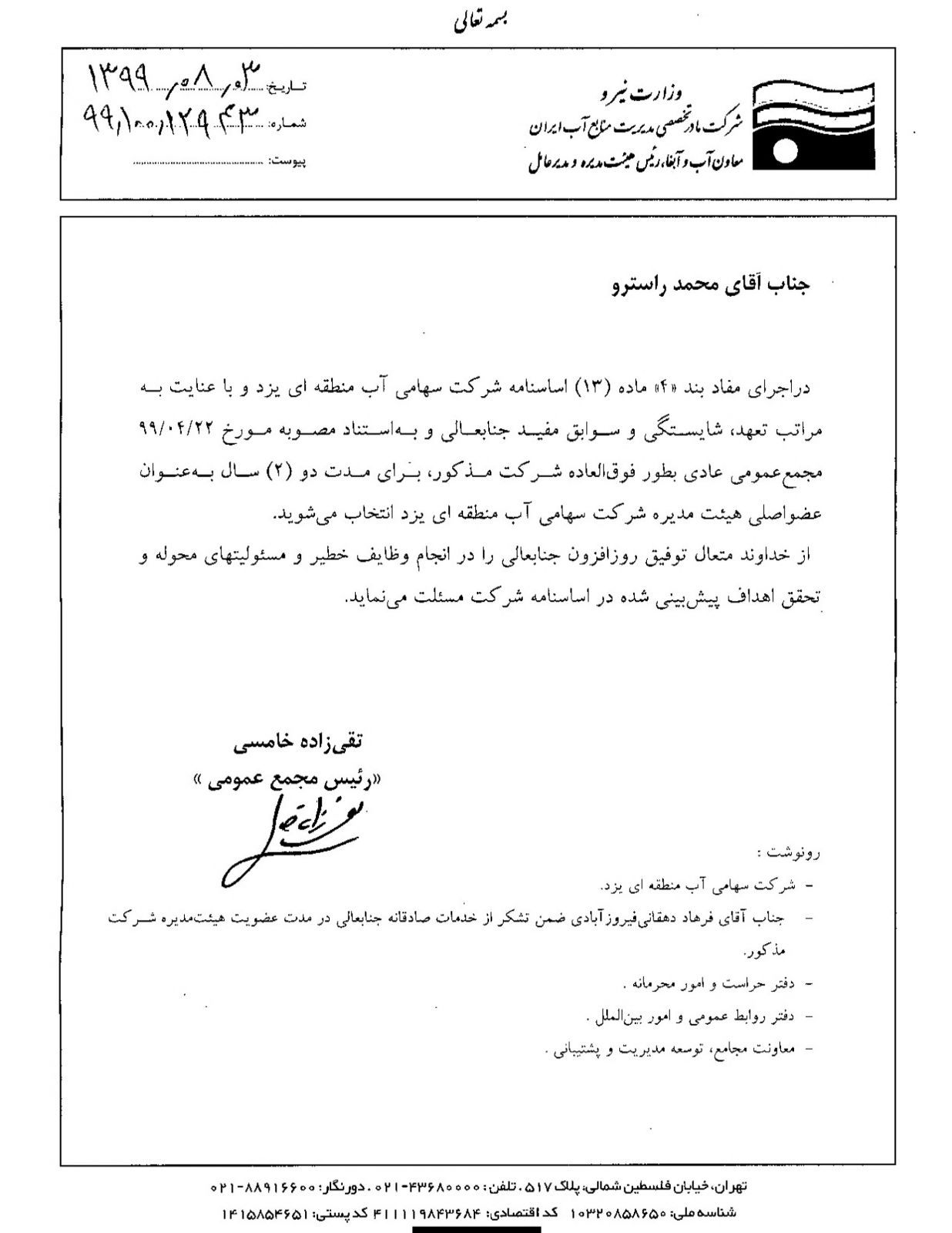 به گزارش روابط عمومی شرکت آب منطقه ای یزد، براساس این حکم "محمدراسترو" مدیر حوزه هیئت مدیره و مدیرعامل شرکت آب منطقه ای یزد به مدت دو سال به عنوان عضو اصلی هیئت مدیره این شرکت انتخاب شد.
