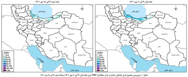 بر این اساس حوضه آبریز دریای خزر در هفته منتهی به ۱۵ مهر بیشینه بارش ۲۸.۴ میلیمتری و متوسط محدوده ۲.۵ میلیمتری را خواهد داشت که بیشترین میزان در بین حوضههای آبریز کشور خواهد بود.