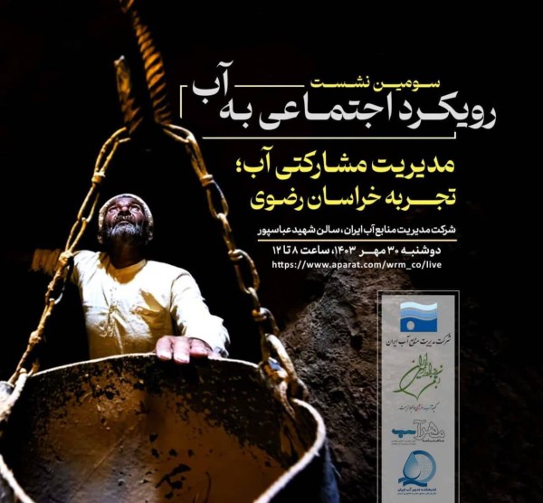 به گزارش خبرنگار شبکه خبری آب ایران، شرکت مدیریت منابع آب ایران با همکاری انجمن روابط عمومی ایران، ماهنامه «مهراب» و اندیشکده تدبیر آب، موضوع سومین نشست از سلسله نشستهای رویکرد اجتماعی به آب را به موضوع «مدیریت مشارکتی آب؛ تجربه خراسان رضوی» اختصاص داده است. این نشست در روز دوشنبه ۳۰ مهر ماه از ساعت ۸ تا ۱۲:۳۰ برگزار میشود.