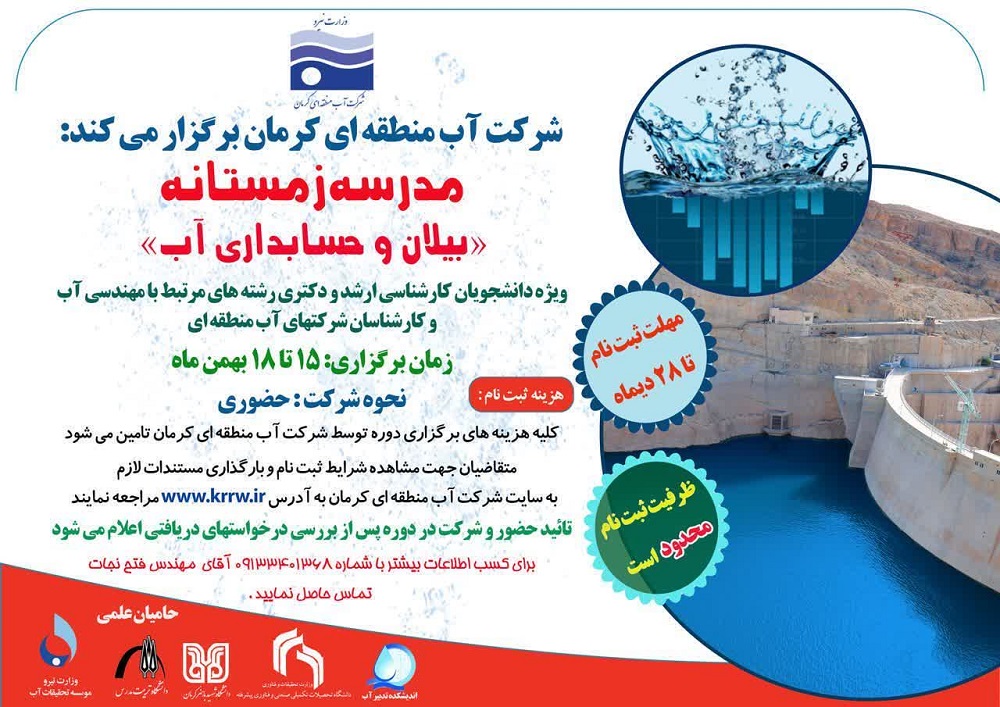 به گزارش شبکه خبری آب ایران به نقل از روابط عمومی شرکت آب منطقهای کرمان، محسن اسدی معاون برنامهریزی این شرکت تصریح کرد: این رویداد که قرار است به میزبانی شرکت آب منطقهای کرمان در روزهای ۱۵ تا ۱۸ بهمن ماه برگزار شود، با موضوع بیلان و حسابداری آب و با شرکت تعداد زیادی از دانشجویان مقاطع کارشناسی ارشد و دکترا دانشگاههای کشور و کارشناسان جدیدالاستخدام شرکتهای آب منطقهای کل کشور در حال برنامهریزی است.