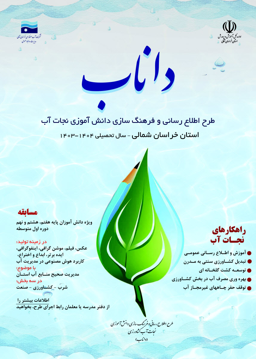 تفاهمنامه همکاری آموزشی و اجرای طرح داناب بین شرکت آب منطقهای و اداره کل آموزش و پرورش خراسان شمالی در آبانماه گذشته امضا شده و کارگاههای آموزشی و توجیهی لازم برای معلمان رابط آموزشگاهها نیز در آذرماه گذشته برگزار شده است.