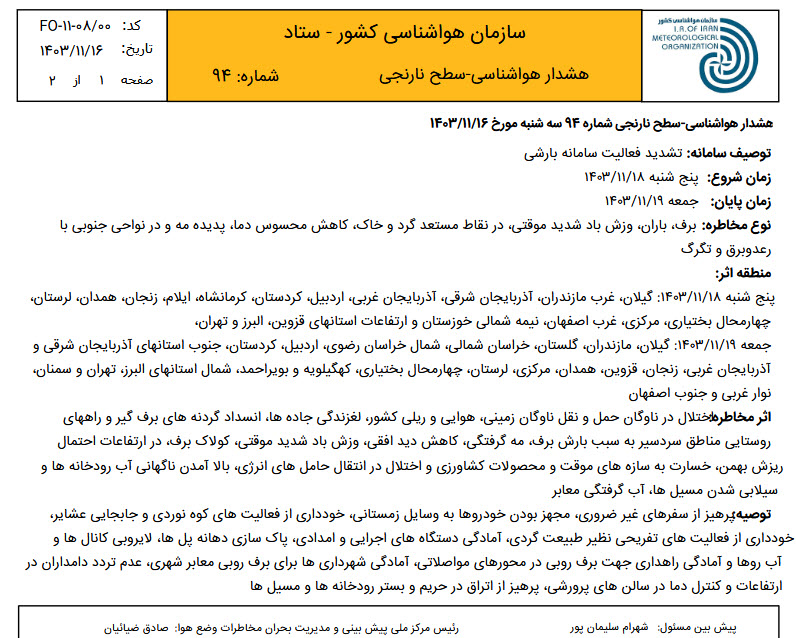 به گزارش شبکه خبری آب ایران به نقل از پایگاه اطلاع رسانی شرکت آب منطقهای خراسان شمالی، بر این اساس، بارش برف و باران و وزش موقت باد شدید و کاهش محسوس دمای هوا برای روز جمعه در خراسان شمالی پیش بینی شده است و احتمال بالا آمدن ناگهانی آب رودخانهها و سیلابی شدن مسیلها وجود دارد.