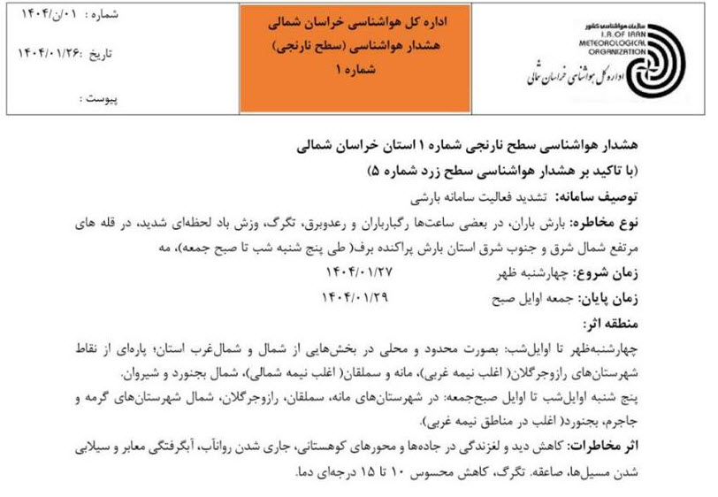 با توجه به هشدار نارنجی و پیش بینی اداره کل هواشناسی خراسان شمالی برای رگبار باران و سیلابی شدن مسیلها به گردشگران و ساکنان محلی پیرامون رودخانهها و سدها و بندهای انحرافی خراسان شمالی توصیه میشود از نزدیک شدن به مخازن سدها و بندهای انحرافی و یا اتراق در حاشیه رودخانهها خودداری کنند.