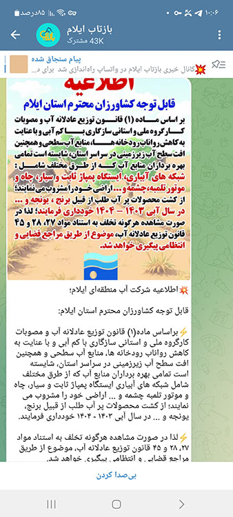متن این اطلاعیه به شرح زیر است: «بر اساس ماده (۱) قانون توزیع عادلانه آب، و با استناد به مصوبات کارگروه ملی و استانی سازگاری با کمآبی، و با توجه به کاهش روانآب رودخانهها، منابع آب سطحی و همچنین افت سطح آبهای زیرزمینی در سراسر استان، شایسته است تمامی بهرهبرداران منابع آب که به روشهای مختلف از جمله شبکههای آبیاری، ایستگاههای پمپاژ ثابت و سیار، چاه، موتور تلمبه، چشمه و... اقدام به آبیاری اراضی خود مینمایند، در سال آبی ۱۴۰۳–۱۴۰۴ از کشت محصولات پرآببر نظیر برنج، یونجه و... خودداری فرمایند.
