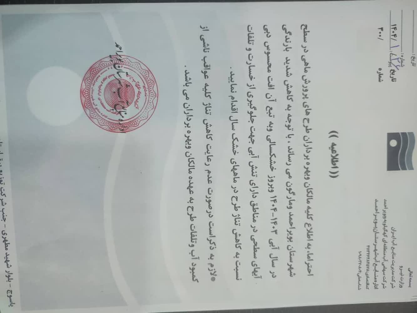 همچنین در این اطلاعیه آمده است: در صورت عدم رعایت کاهش تناژ، تمامی عواقب ناشی از کمبود آب و تلفات طرح بر عهده مالکان و بهرهبرداران خواهد بود.