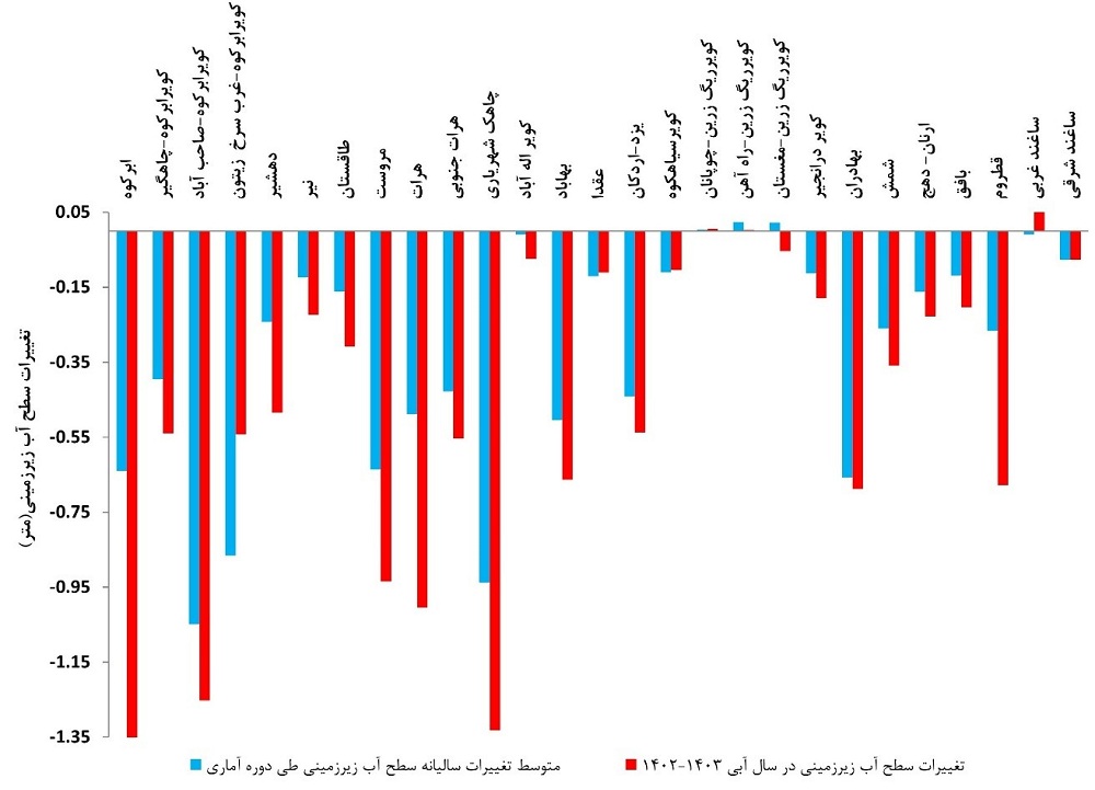وی بیشترین افت سطح آب را مربوط به آبخوانهای ابرکوه، چاهک شهریاری، صاحب آباد، هرات و مروست به ترتیب با ارقام ۱۳۵، ۱۳۳، ۱۲۵، ۱۰۰ و ۹۳ سانتیمتر در سال ذکر کرد و افزود: بررسیها نشاندهنده افزایش افت سطح آب زیرزمینی در سال آبی مذکور نسبت به افت متوسط سطح آب زیرزمینی در درازمدت، در اکثر آبخوانهای استان است.