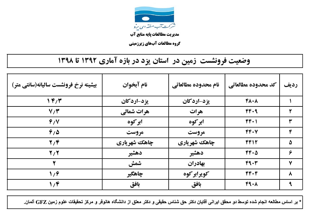 مدیر مطالعات پایه منابع آب شرکت آب منطقهای یزد با اشاره به پدیده فرونشست زمین به عنوان یکی از پیامدهای منفی برداشت بیرویه از آبهای زیرزمینی، گفت: در مناطقی که میزان برداشت از سفرههای آب زیرزمینی بیش از میزان آب ورودی ناشی از بارشها به آنهاست، سطح آب زیرزمینی دچار افت مستمر شده و هر سال پایینتر میرود و اگر این روند با کاهش برداشت از سفرهها متوقف نشود، با گذشت زمان پدیده فرونشست زمین در سفرههای دارای افت مداوم به وقوع میپیوندد.