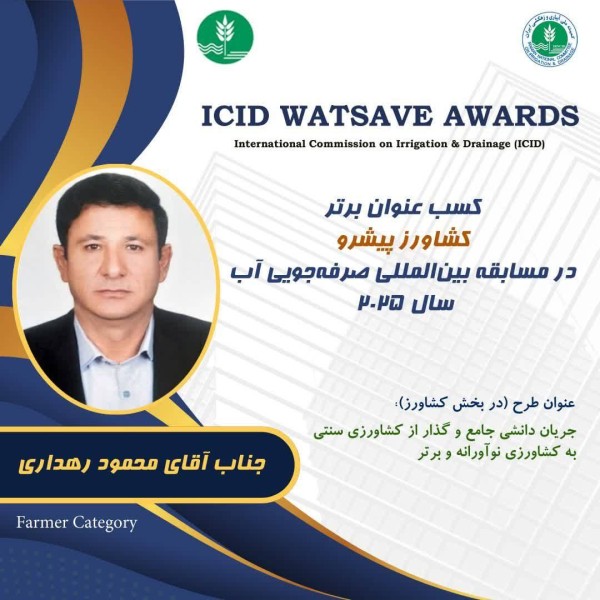 به گزارش خبرنگار شبکه خبری آب ایران، کمیسیون بینالمللی آبیاری و زهکشی (ICID) در مسابقه سالانه صرفهجویی آب در کشاورزی، «محمود رهداری» کشاورز پیشرو از شهرستان هلیلان استان ایلام را بهعنوان برنده بخش «اقدامات اجرایی کشاورزان پیشرو» در سال ۲۰۲۵ معرفی کرد.