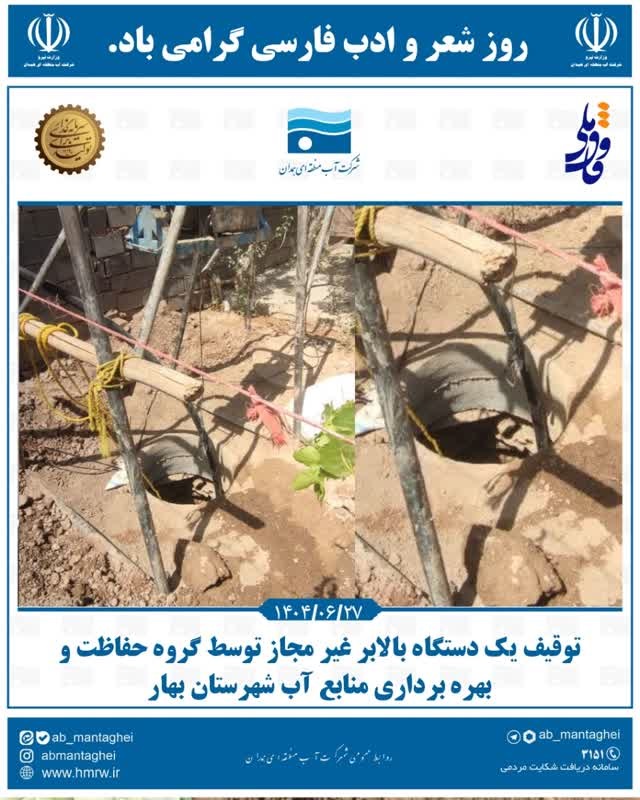 به گزارش شبکه خبری آب ایران به نقل از روابط عمومی شرکت آب منطقهای همدان، گروه گشت و بازرسی مدیریت منابع آب شهرستان بهار یک دستگاه تراکتورحفاری غیرمجاز را هنگام حفاری در اراضی شهرستان بهار بود توقیف و همراه با سایرادوات حفاری به پارکینگ منتقل شد و حفاران نیز به مراجع قضایی معرفی شدند.