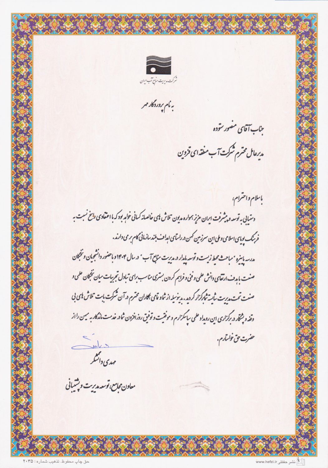 مدرسه پاییزه «مباحث محیط زیست و توسعه پایدار در مدیریت منابع آب» در سال ۱۴۰۴ و با حضور دانشجویان و نخبگان صنعت با هدف ارتقای دانش علمی و فنی و فراهم کردن بستری مناسب برای تبادل تجربیات میان نخبگان علمی و صنعت تحت مدیریت شایسته شما برگزار گردید. بدینوسیله از شما و تمامی همکاران محترم در آن شرکت بابت تلاش های بی وقفه و پشتکار در برگزاری این رویداد علمی سپاسگزارم و موفقیت و توفیق روزافزون شما در خدمت ماندگار به میهن را از حضرت حق خواستارم.