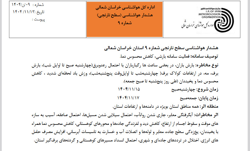 به گزارش شبکه خبری آب ایران به نقل از پایگاه اطلاعرسانی شرکت آب منطقهای خراسان شمالی، بر این اساس، از چهارشنبه ۱۵ بهمن تا صبح جمعه ۱۷ بهمن احتمال رگبار باران و بارش برف در این استان پیش بینی شده است که ممکن است موجب آبگرفتگی معابر و سیلابی شدن مسیلها شود.